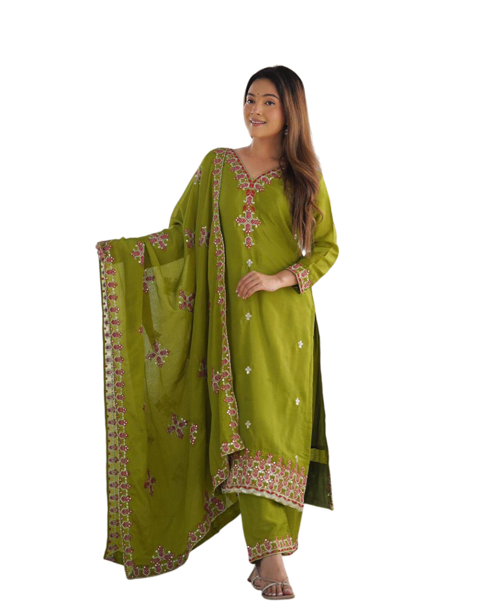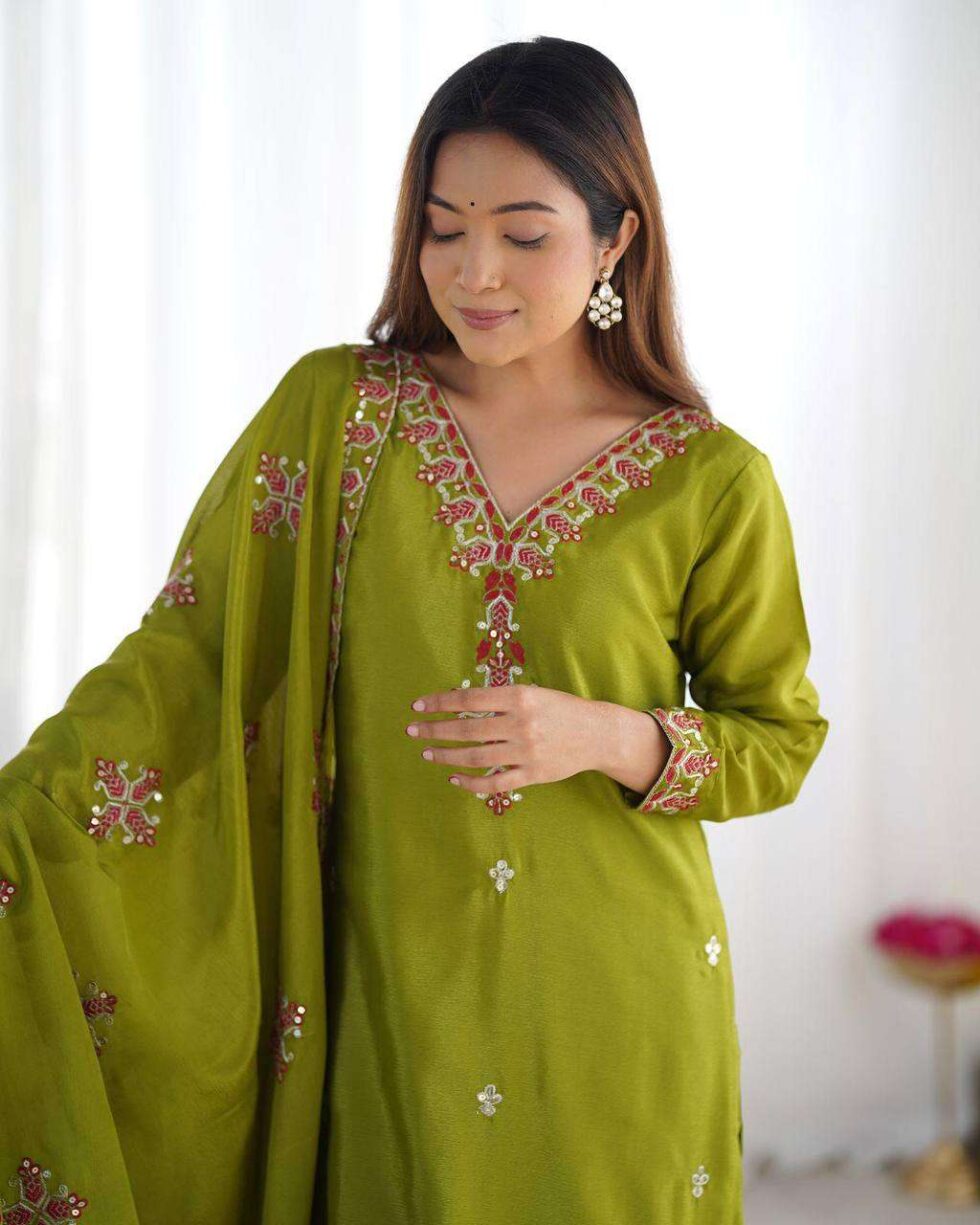 Chinnon Silk Embroidery Sequence Work and Lace Work Straight Kurti With Pant and Dupatta For Women (Lime Green (M)