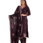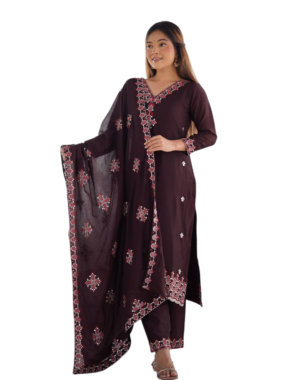 Chinnon Silk Embroidery Sequence Work and Lace Work Straight Kurti With Pant and Dupatta For Women (Maroon (M)