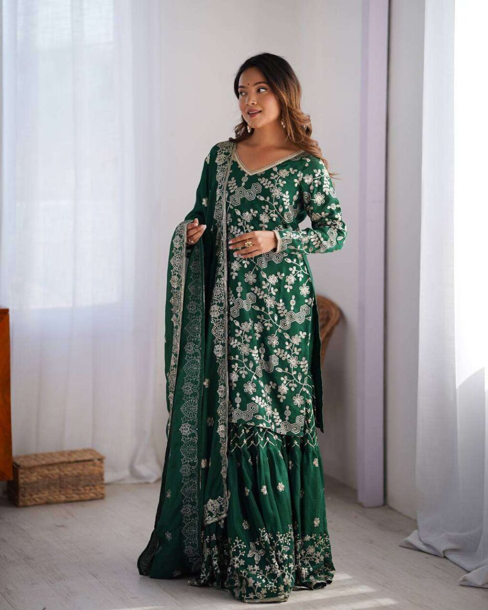Chinon Silk Embroidery Sequence Work Straight Kurti With Sharara Suit and Dupatta Set For Women -Green (L)