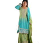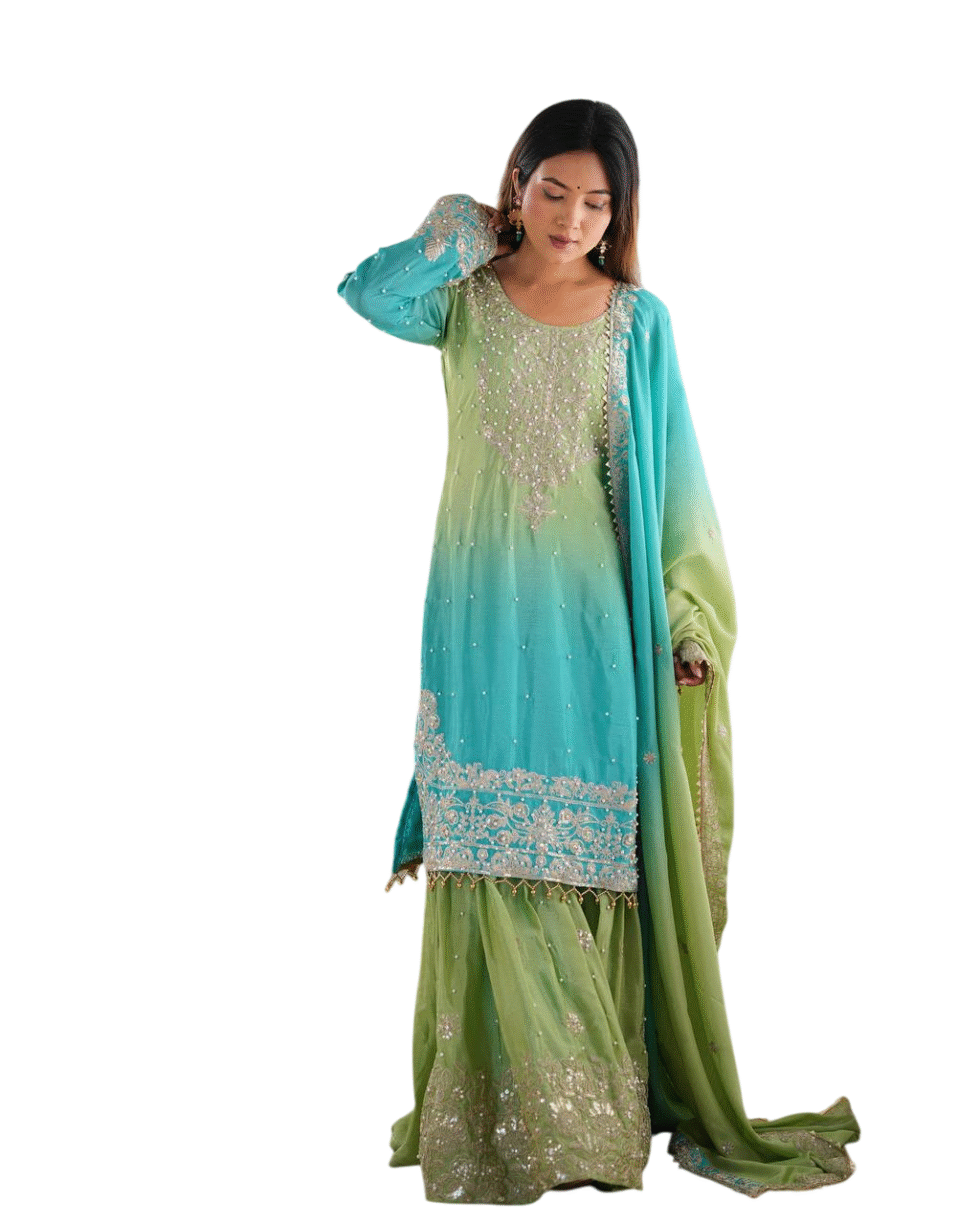 Chinon Silk Sequence With Rivet Moti Work Straight Kurta With Sharara and Dupatta Set For Women -Green (M)