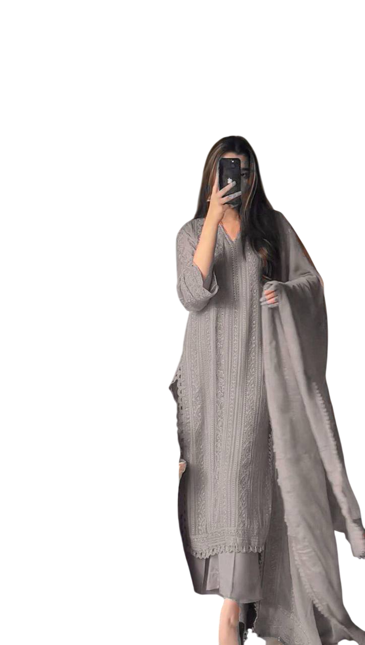 Chinon Silk with Cotton Thread Embroidery Straight Kurti With Pant and Dupatta Set For Women -Grey (XXL)