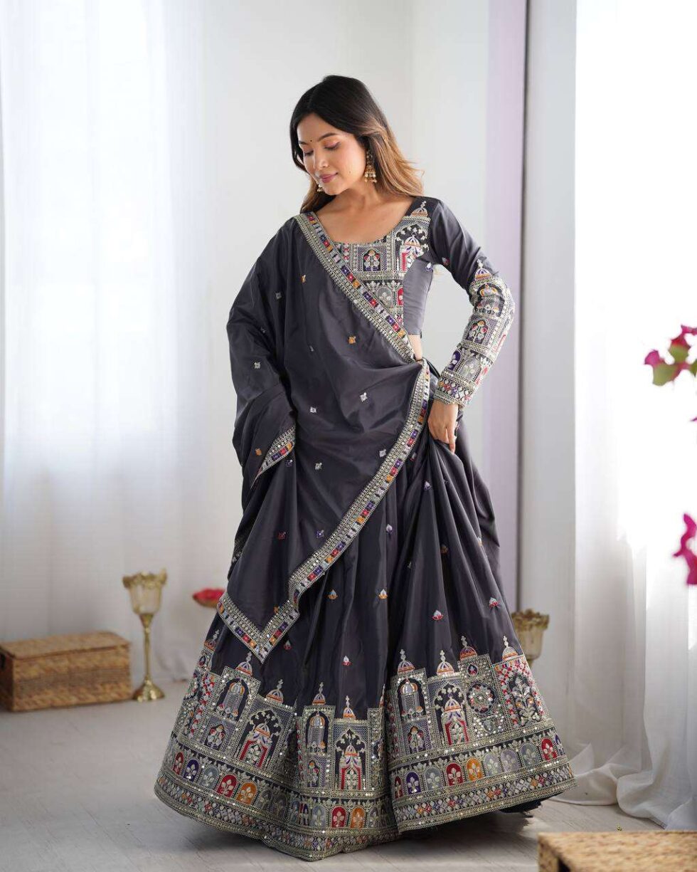 Crepe Silk Sequence Embroidery and Zari Work Rajsthani Lehenga Choli with Dupatta For Women -Black (XXL)