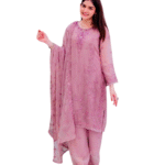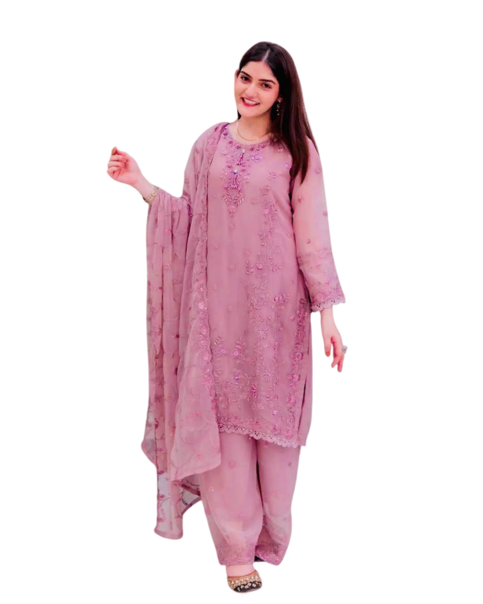 Faux Georgette Embroidery work Straight Kurti With Pant and Dupatta Set For Women -Onion Pink (M)