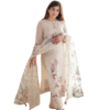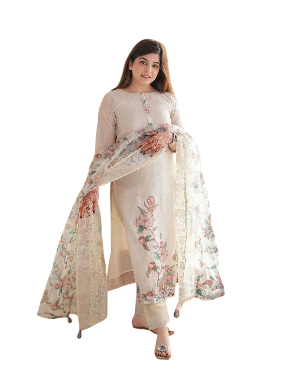 Lilan Cotton Floral Printed Straight Pakistani Kurti with Pant and Dupatta For Women -Beige (M)