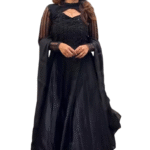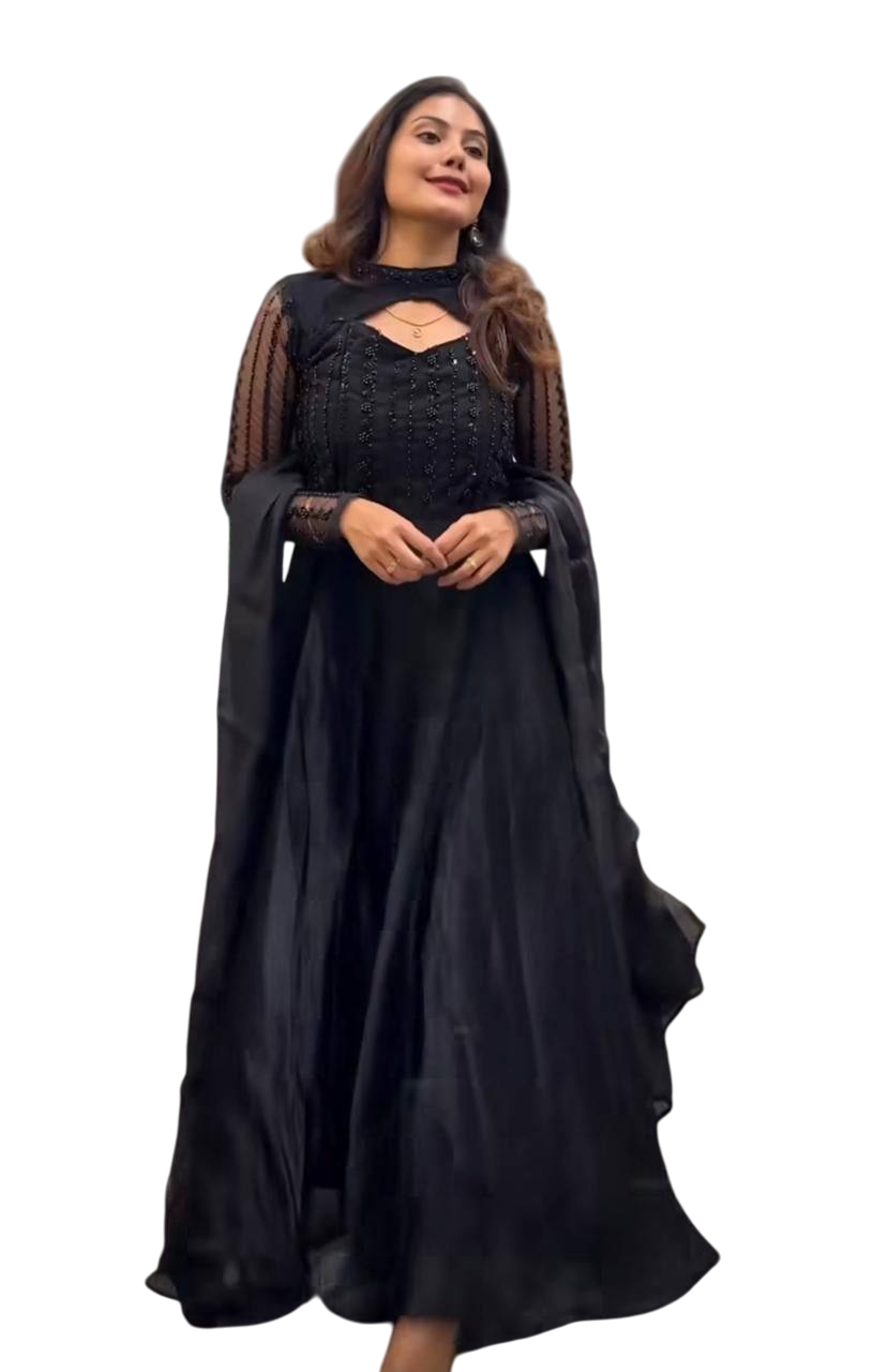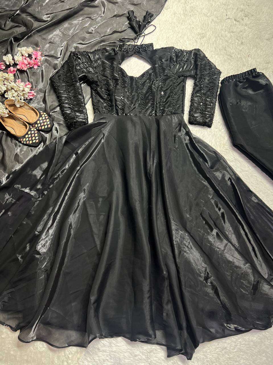 Silk Heavy Embroidery Sequence Work Long Anarkali Kurti With Pant and Dupatta Set For Women -Black (XXL)