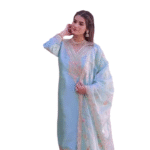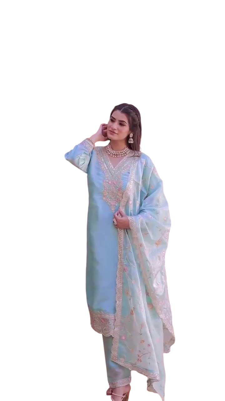 Silk Heavy Embroidery Sequence Work Top-Bottom Straight Kurti With Pant and Dupatta Set For Women -Sky Blue (XXL)